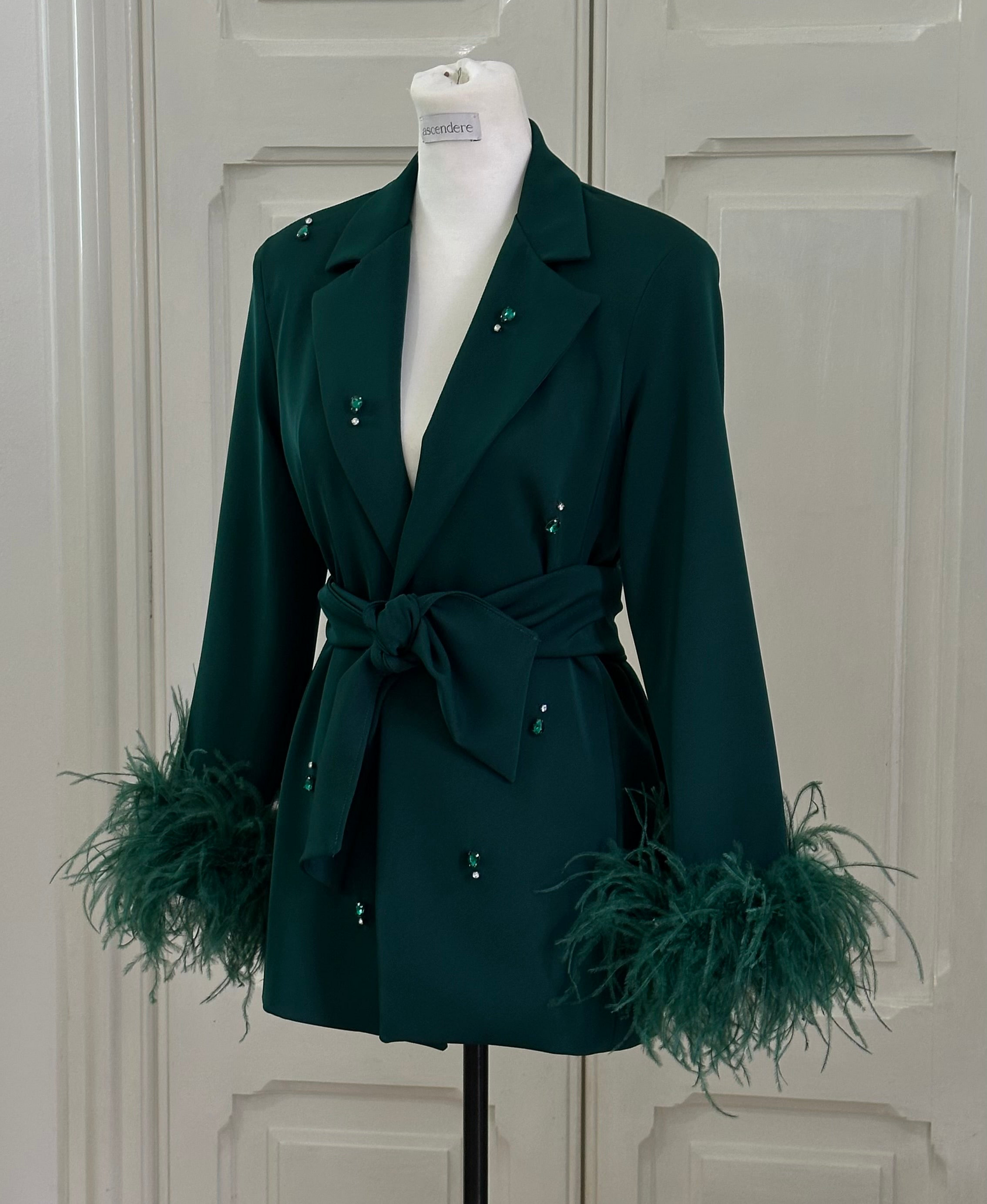 Giacca taglio maschile 'Camille' foderata, cintura annodabile rimovibile con dettaglio sul retro. Pietre ricamate a mano. Piume sul fondo manica e ricamo a scelta.